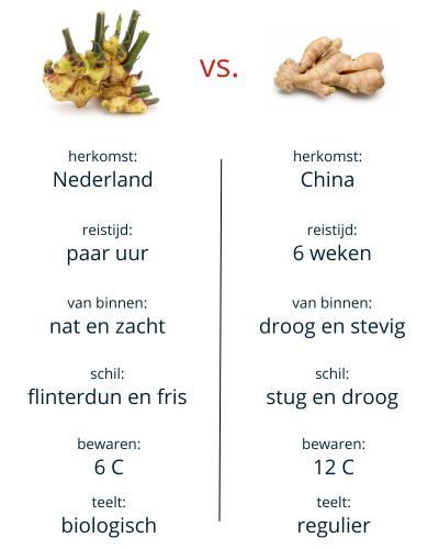 Deze gember is in Nederland geteeld en daarom veel verser dan de gember die geïmporteerd wordt. Bovendien wordt de gewone gember gedroogd om haar houdbaar te maken. Verse gember is ongedroogd en bevat veel meer smaak. Het groene loof dat er aan zit gebruik je voor thee of om soep mee te maken.